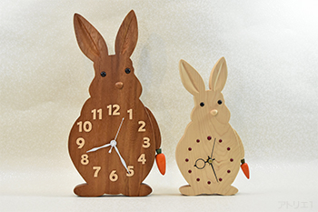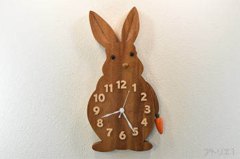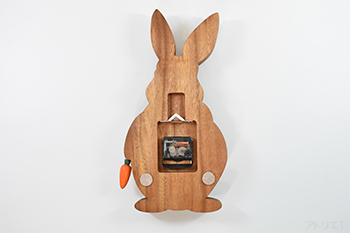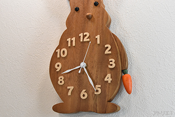 時計のベースは「モンキーポッド」で、この木なんの木、気になる木・・・」という某電機メーカーのCMでおなじみの木です。モンキーポッドはマメ科の木でその実を猿が好んで食べることから名がついたようです。大きいものでは枝張りが60m近くにまでなるなど、非常に雄大で大きな木です。その自然な風合いを活かしてうさぎの形に切り出し、鼻も同じモンキーポッドで作ってあります。まあるくかわいらしい目にはオニキスを使用、更に小さなにんじんは銀杏で作り、アクリル塗料で彩色して手に持たせてアイキャッチにしてあります。時刻の数字には、ブナの木からひとつずつ切り出した数字を使い、視認性をよくしました。針は、時刻が見やすいように白い針を採用しました。仕上げには、モンキーポッドの木の風合いを損なわないよう、蜜蝋クリームを塗ってあります。
